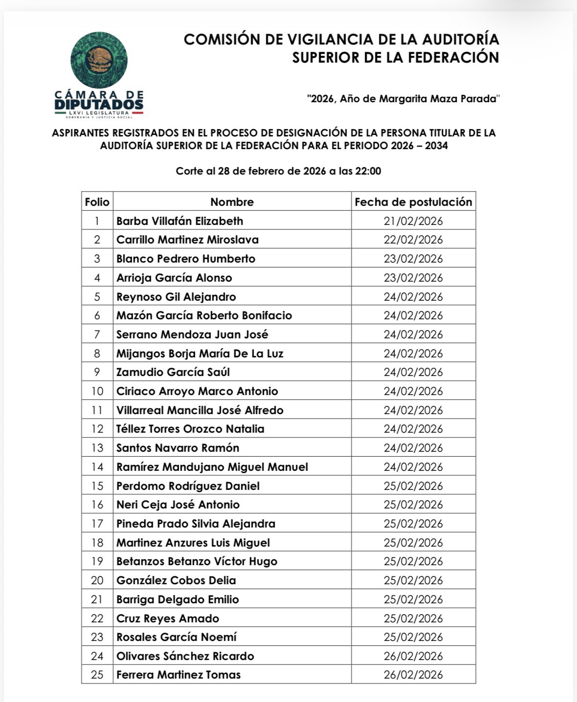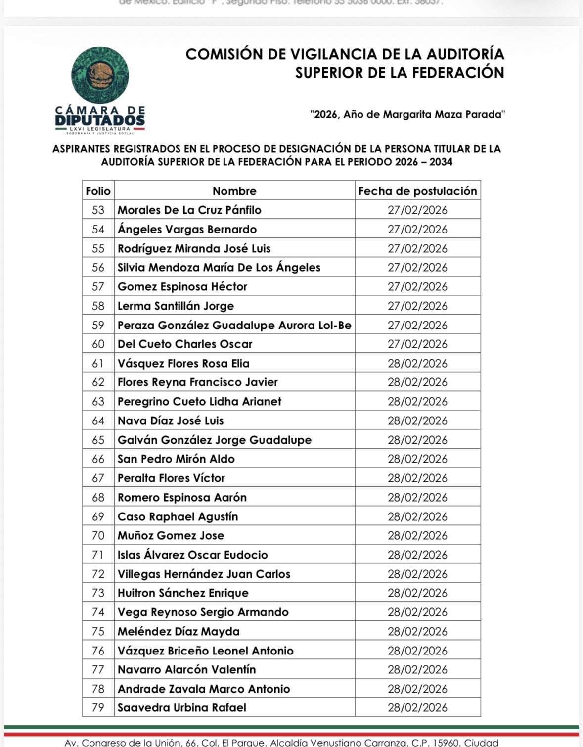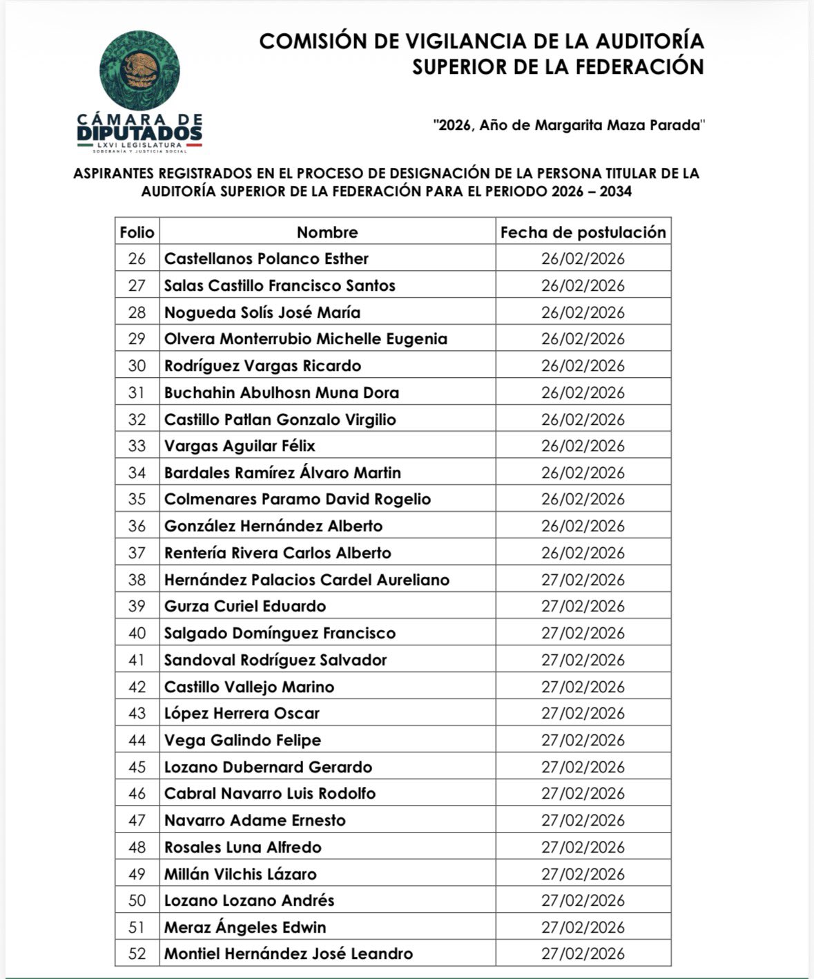 El proceso se desarrolla conforme a la convocatoria aprobada el 18 de febrero por la Comisión de Vigilancia de la Auditoría Superior de la Federación.