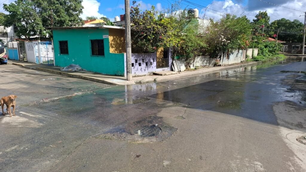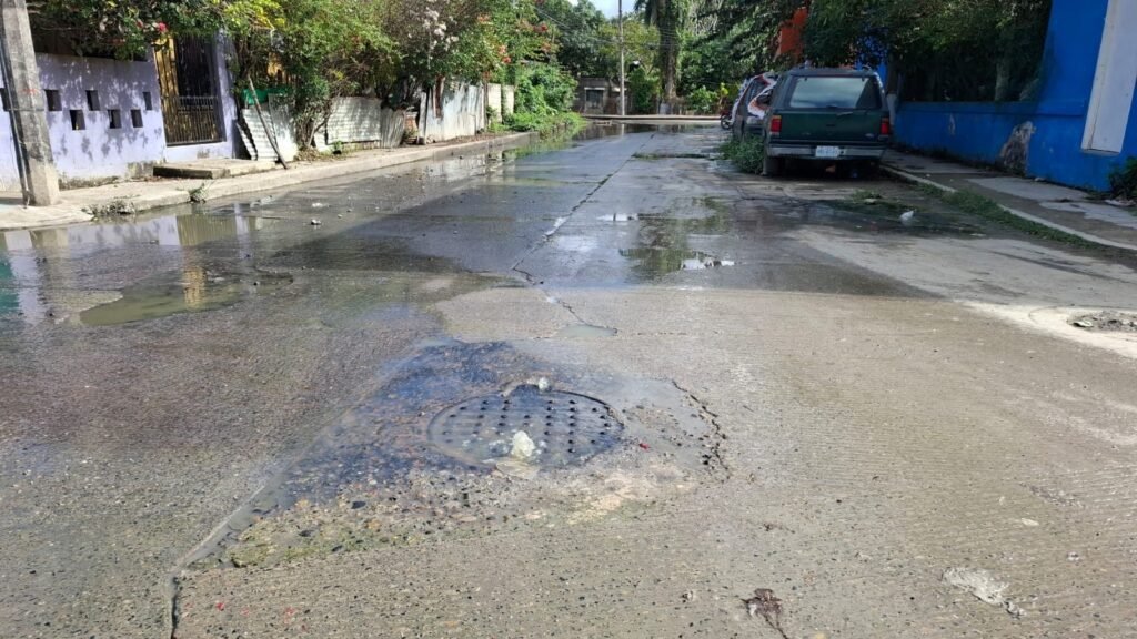De acuerdo con los lugareños, diariamente brotan aguas negras del drenaje, lo que genera fuertes y constantes malos olores, afectando directamente a las familias que habitan en la zona, así como a quienes transitan por el lugar.
