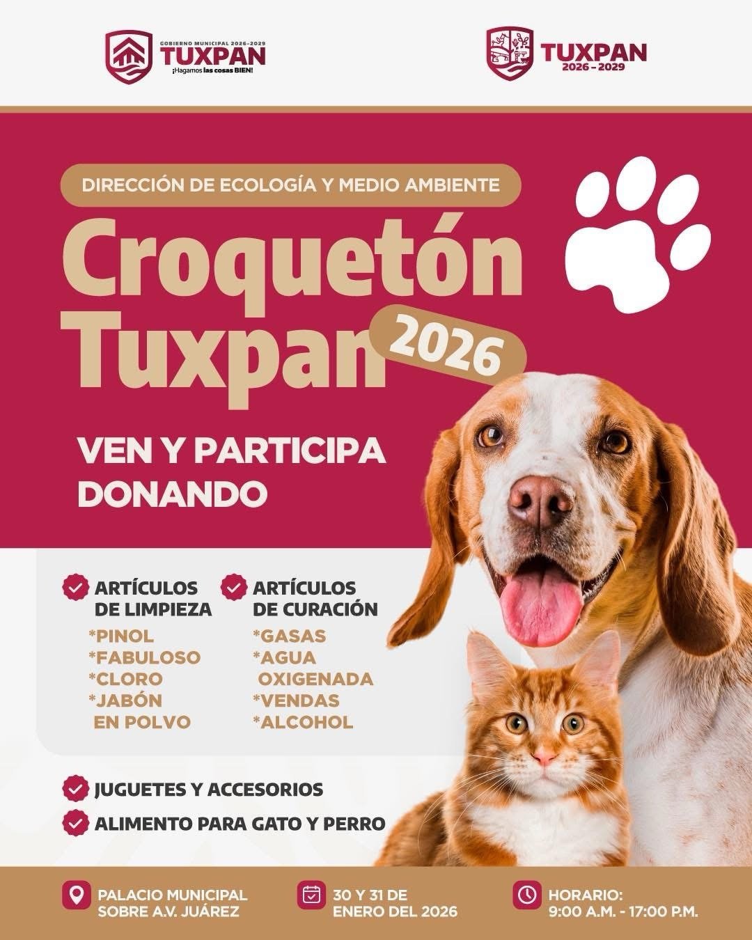 Tuxpan, Ver.- La Dirección de Ecología y Medio Ambiente del Ayuntamiento de Tuxpan lanzó la invitación oficial al Croquetón Tuxpan 2026, una iniciativa solidaria que tiene como propósito reunir insumos para mejorar la atención y el bienestar de perros y gatos que requieren apoyo.