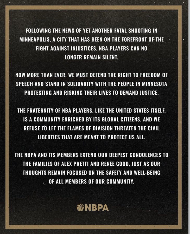 La NBPA y sus miembros expresamos nuestras más profundas condolencias a las familias de Alex Pretti y Renée Good, y nuestros pensamientos siguen centrados en la seguridad y el bienestar de todos los miembros de nuestra comunidad.