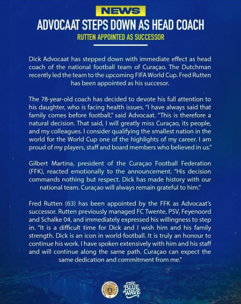 🚨 Dick Advoocat (78) has stepped down from his role as head coach of the Curaçao national team with immediate effect.